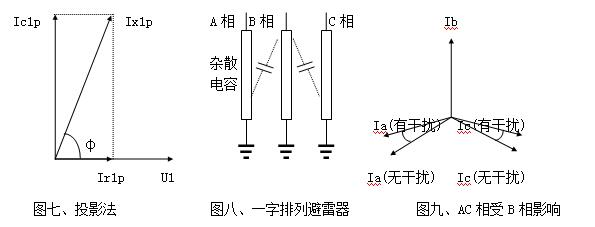 現場測量時,一字排列的避雷器(圖八),中間B相通過雜散電容對A、C泄漏電流產生影響,使A相φ減小,阻性電流增大,C相φ增大,阻性電流減小甚至為負,這種現象稱相間干擾(圖九)。