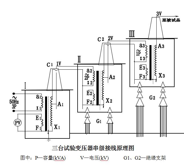 在上圖中,在第一級和第二級的每個單元試驗變壓器中都有一個勵磁繞組A1、C1和A2、C2。在三臺串級試驗變壓器基本原理中,低壓電源加在試驗變壓器Ⅰ的初級繞組a1x1上,單臺試驗變壓器Ⅰ、Ⅱ、Ⅲ的輸出電壓都是V。勵磁繞組A1、C1給第二級試驗變壓器Ⅱ的初級繞組供電;第二級試驗變壓器Ⅱ的勵磁繞組A2、C2給第三級試驗變壓器Ⅲ的初級繞組供電。第二級試驗變壓器Ⅱ和第三級試驗變壓器Ⅲ的箱體分別處在對地為1V和2V的高電位上,所以箱體對地是絕緣的,試驗變壓器Ⅰ的箱體是接地的。這樣第一級、第二級、第三級試驗變壓器對地的額定輸出電壓分別為1V、2V、3V;其額定容量分別為3P、2P、1P。