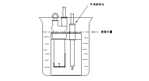 (3).如仍不能拆卸,請將滴定池放入2升的燒杯中,慢慢加入濃度為5%的氯化鉀溶液侵泡,其液面位置見圖十四,必須十分注意,不要讓測量電極﹑陰極室電極的引線套端頭進入液體,侵泡約十幾小時或24小時后,即可拆卸(此方法可重復進行)。