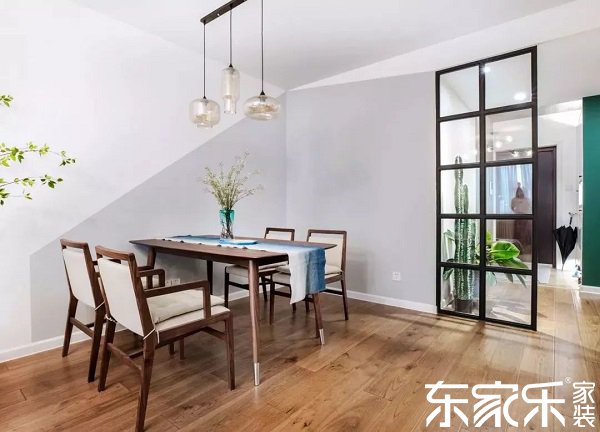 玄關與客餐廳之間,通過一扇黑色框架玻璃門隔斷,讓家的擴展性更強,餐廳胡桃木色餐桌椅加上個性吊燈,古典與現代的完美結合。
