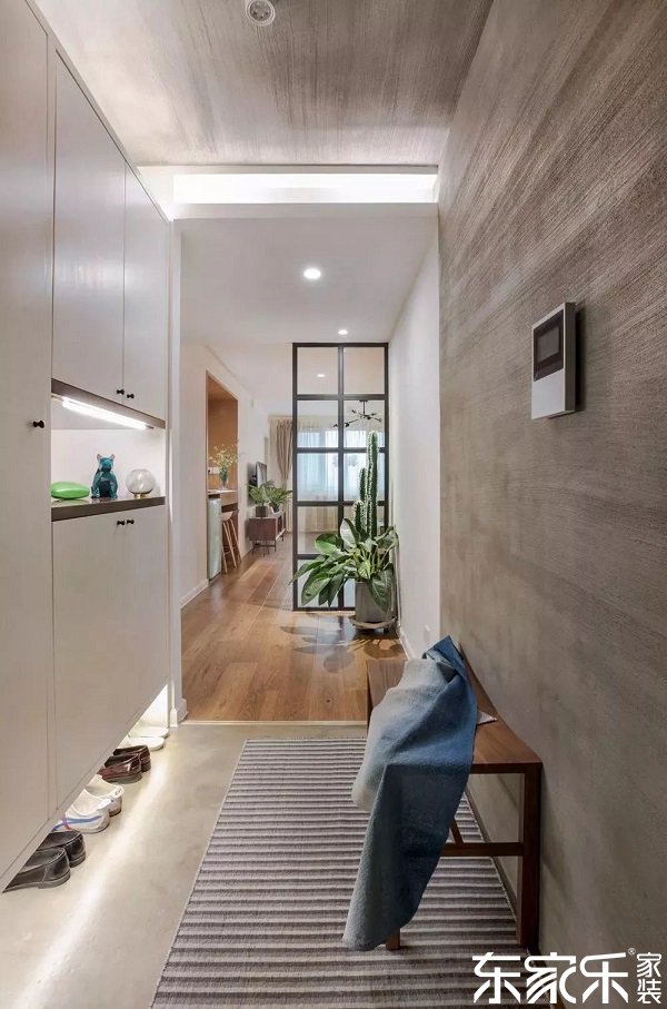 玄關處右側空出的區域設計成了一個衣帽柜,基本可以滿足大部分衣物的收納需求,個性化的燈具效果讓原本衣柜底部黑暗的區域變得明亮起來,再也不用擔心晚上找不到鞋了!