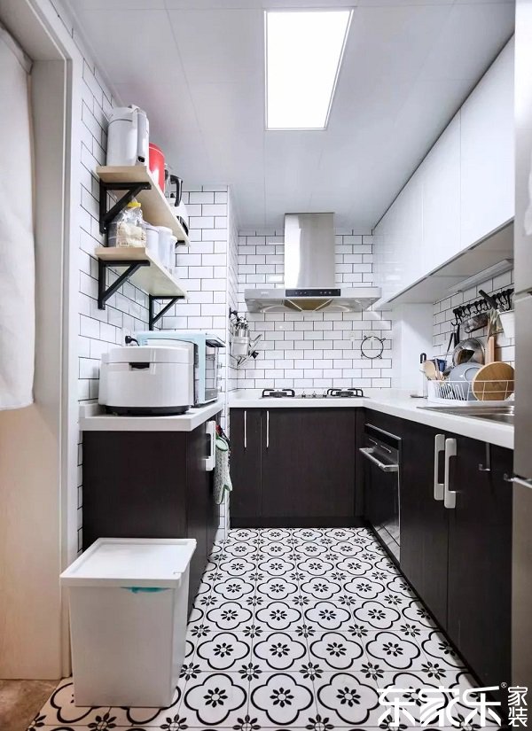 廚房空間不大,U型設計讓增加了可收納物品的空間,擺放也十分合理。黑色+白色為主色調,給人的感覺簡約又時尚。
