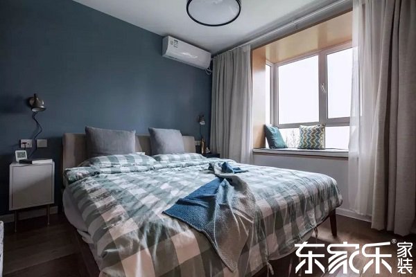 主臥的床頭背景墻為深藍色,搭配淺灰色床靠,讓睡眠環境更加靜謐。