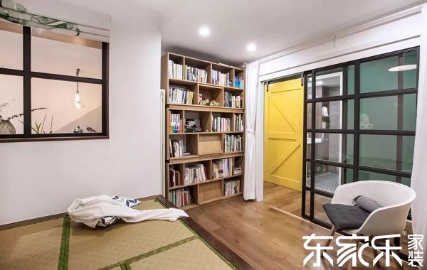 次臥采用榻榻米床的設計,床尾設置了整面的書柜,節省空間,增加收納面積