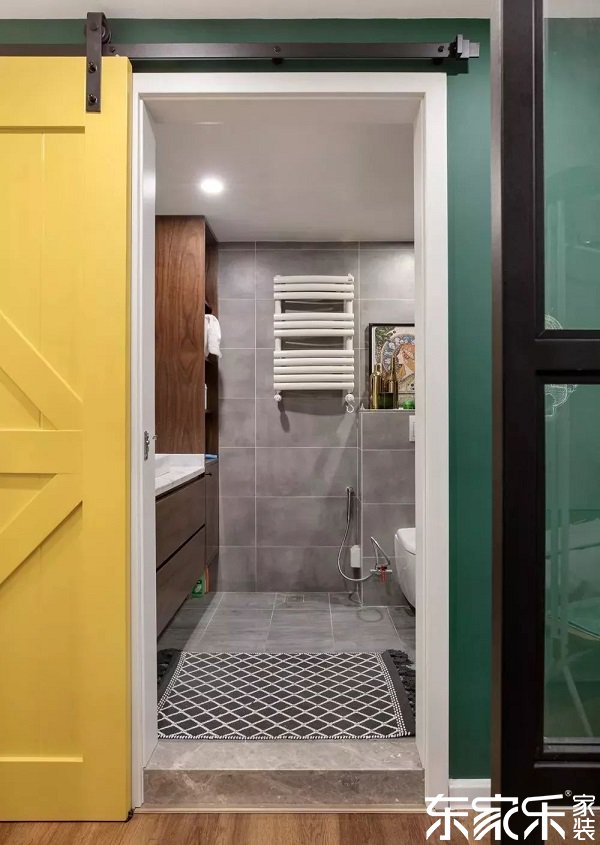 衛生間采用的是谷倉門,讓空間更寬敞,明亮的黃色與墨綠色的搭配,讓家更顯精致格調。