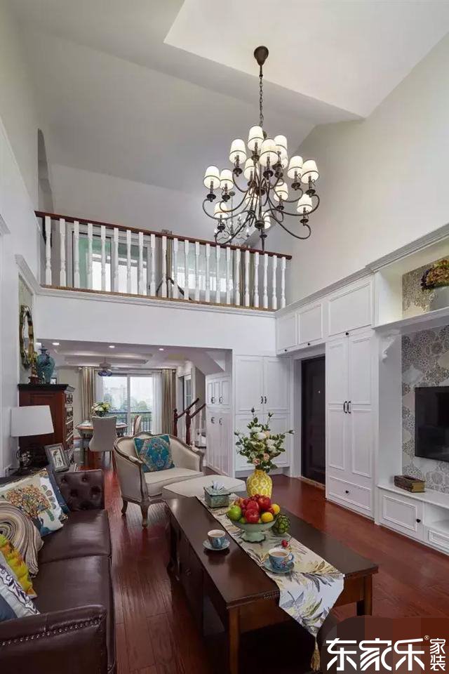 頂樓復式的戶型,進門就是客廳,照樣不設置進門障礙,左右兩邊滿足收納即可,保持空間的南北通透。