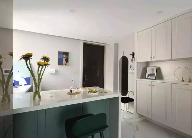 入戶右側是一個L型大吧臺,折角部分不僅是廚房的延伸部分,平時也可以當做開放式工作間。