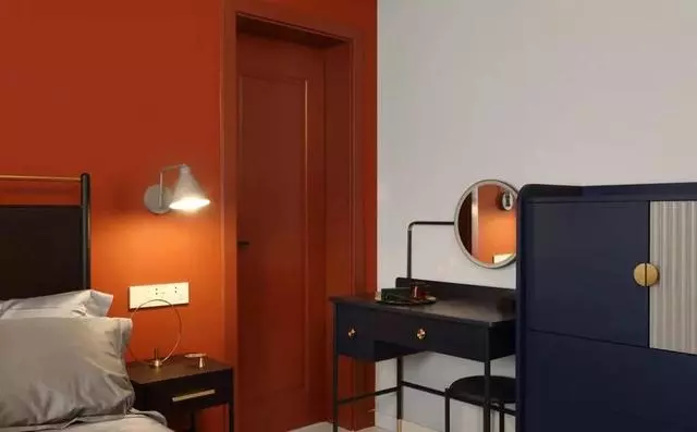 主臥在床和床頭柜的選擇上以沉穩的黑色為主,墻面右側有一扇通向儲物間的門,考慮到視覺色塊的統一性,將門框和門板全部涂刷為同款橙色。