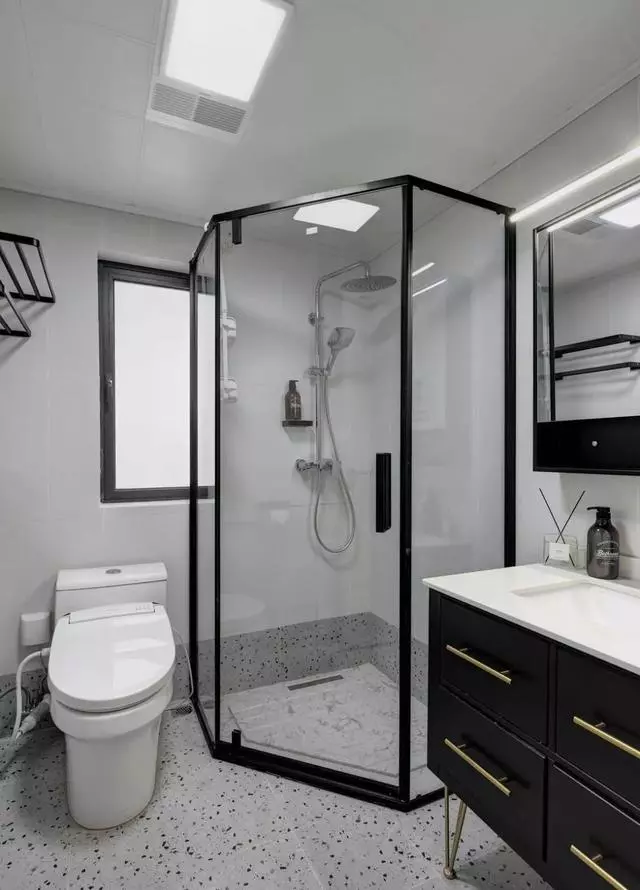衛生間雖小,也做了干濕分區,衛浴柜的金色拉手和細腳的設計,給人以視覺上的驚喜。