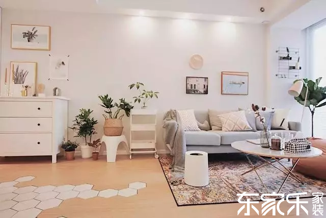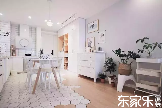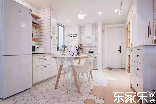 入戶沒有玄關,一側靠墻設計了鞋柜和收納柜,另一側是開放式的餐廚區域,實木地板與六角磚的拼接組合,瞬間提升整個家居的顏值。
