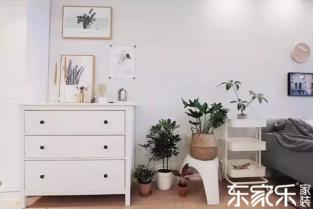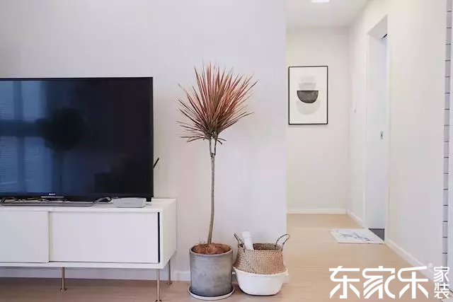 電視背景墻留白,用簡單的盆栽裝飾,顯得文藝又精致,電視柜還增加了家里的收納空間。