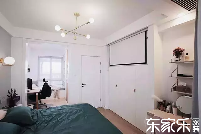 床頭靠窗的區域,被設計成小書房,簡單的擺放一張書桌和椅子,小小的空間作為娛樂辦公來使用,非常實用,臥室沒有擺放電視的空間,所以裝了一個投影儀,休閑時間可以看看電影也是不錯的選擇。