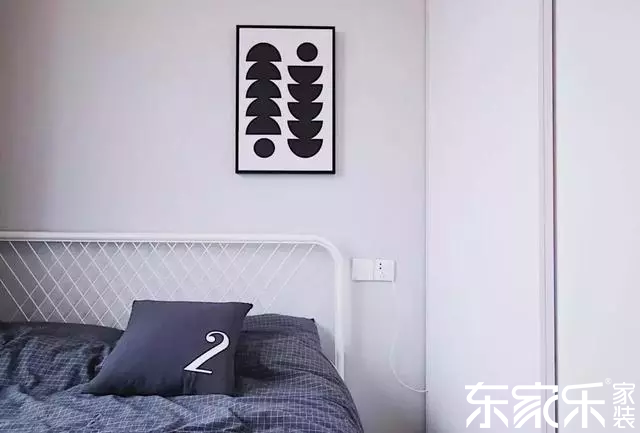 次臥的布置相對簡單,整體以淺灰色為基調,搭配白色鐵藝床和黑白掛畫,簡約舒適。