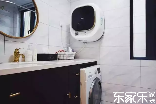 衛生間整體是黑白搭配的,洗衣機放置在洗漱柜中,臺面可以放置不少東西。大理石墻磚加上些許金屬點綴,充滿精致格調。