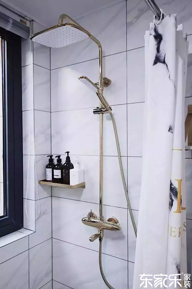 干濕區用一塊浴簾作為隔斷,實用又能有效的阻擋水,花灑選的是恒溫的,避免洗澡來回調節溫度。