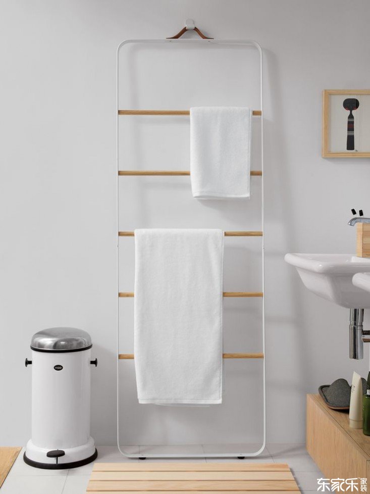 上圖:Menu Bath Towel Ladder的皮革手柄可以掛在墻上,底部有防滑腳。這里顯示的是黑色的橡木橫檔,