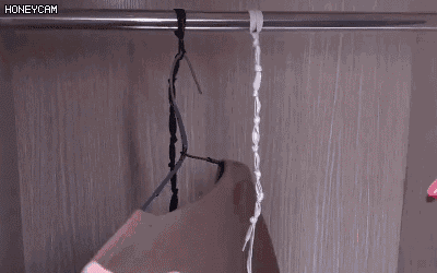將鞋帶系在掛衣桿上,每隔兩厘米左右打個小結,依次系上4-5個繩結,然后便可將衣架掛在每個繩結處。照這樣多系上幾根鞋帶,可制成多功能衣架,大大增加懸掛衣服的數量。