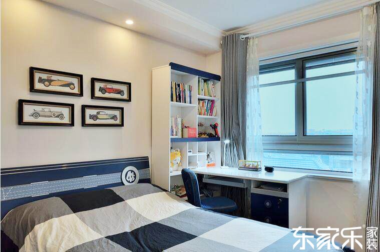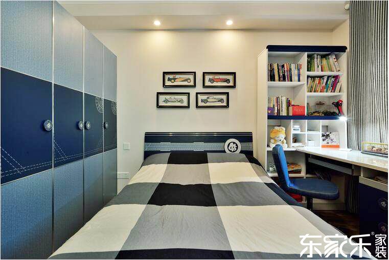 次臥室以藍(lán)色和白色為主色調(diào),白色的墻面和書桌書柜與藍(lán)色的衣柜和椅子相結(jié)合,再搭配幾幅色彩豐富的掛畫,讓空間更加生動(dòng)活潑。