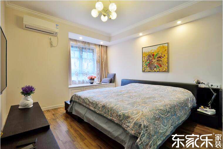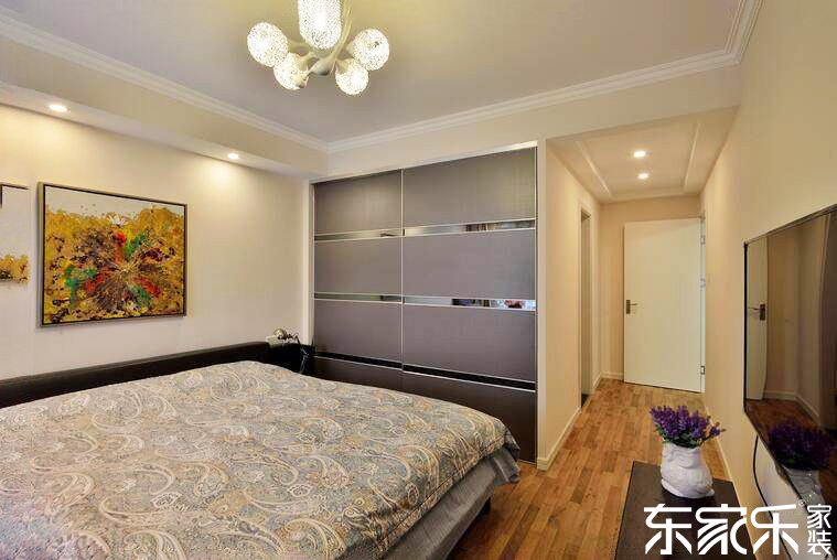 主臥室以灰色和白色為主色調(diào),搭配黃色和紫色的軟裝,看起來也是生動(dòng)充滿活力。乳白色的墻體與原木色的木地板增加了空間的舒適度,黃色的裝飾畫和紫色的薰衣草裝飾花則豐富了空間的色彩。